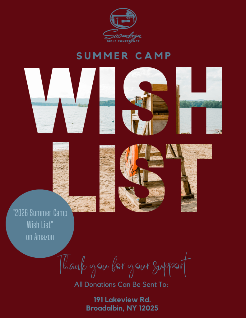 May 16, 2025April 1, 2026 by Sacandaga Bible Conference 2026 Summer Camp Wishlist Amazon Wishlist Share this: Share on X (Opens in new window) X Share on Facebook (Opens in new window) Facebook